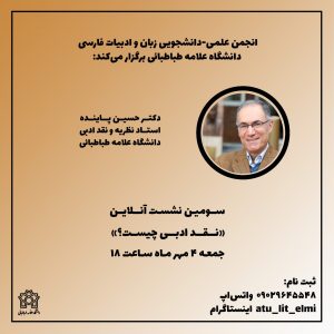 نوشتهشده در ۱۳۹۹-۰۶-۲۷۱۴۰۳-۱۰-۰۷ از اطلاعیهی وبینار دربارهی چیستی نقد ادبی انجمن علمی ـ دانشجویی زبان و ادبیات فارسی دانشگاه علامه طباطبائی در تاریخ جمعه ۴ مهرماه ۹۹ وبیناری با عنوان «نقد ادبی چیست؟» برگزار میکند. همرسانی این مطلب:مطالب مرتبط:اطلاعیهی کارگاه یکروزه (آنلاین) آشنایی با جهان…اطلاعیهی کارگاه دوجلسهای نقد فیلم (آنلاین)اطلاعیهی وبینار نقد فیلم «سرخپوست» با دو رویکرد