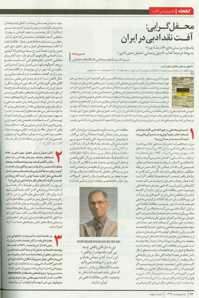 ۴. یکی از ویژگیهای مهم کتاب «اصول و مبانی تحلیل ادبی» توجه به ارائهی نوعی روششناسی برای نوشتن نقد ژورنالیستیست. شما نقدهایی که در مطبوعات ایران نوشته میشود را تا چه حد با معیارهای ارائهشده در کتاب سلینا کوش منطبق میبینید؟