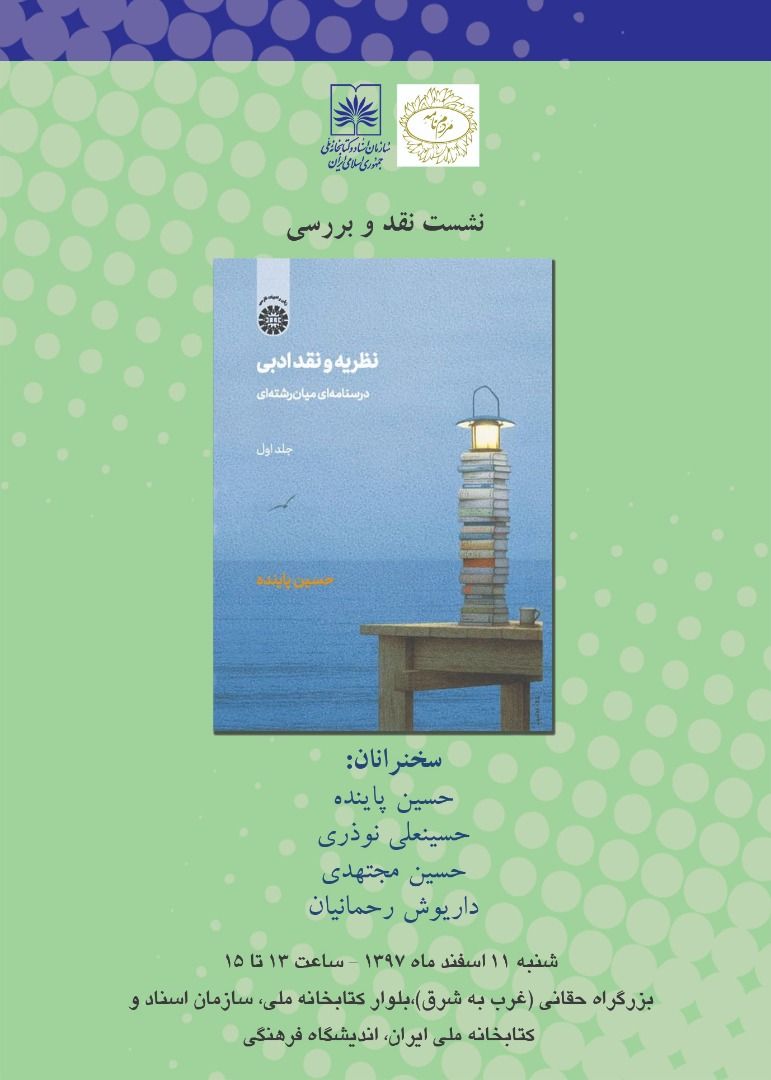کتاب نظریه و نقد ادبی: درسنامهای میانرشتهای موضوع نشستی است که روز شنبه ۱۱ اسفند ۹۷ در محل اندیشگاه فرهنگی کتابخانهی ملی ایران برگزار میشود. در این نشست، علاوه بر حسین پاینده (مؤلف کتاب)، حسینعلی نوذری، حسین مجتهدی و داریوش رحمانیان سخن خواهند گفت. شرکت در این نشست برای همهی علاقهمندان آزاد است.