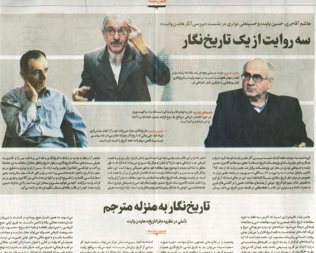 گروه «تاریخ و همکاریهای میانرشتهای» پژوهشکدهی تاریخ اسلام در روز هفتم آذرماه ۹۴ نشستی علمی برای بررسی اندیشههای هِیدن وایت، نظریهپرداز پسامدرن تاریخ، برگزار کرد. سخنرانان این نشست عبارت بودند از هاشم آغاجری، حسینعلی نوذری و حسین پاینده که هر یک از منظری به معرفی آراء هِیدن وایت پرداختند: آغاجری با تأکید بر نظریههای تاریخ، نوذری با تأکید بر نظریههای سیاسی و پاینده با تأکید بر نظریههای نقد ادبی. متعاقباً گزارش مفصلی از این نشست در صفحهی اندیشهی روزنامهی شرق (۹۴/۱۰/۱۲) منتشر شد. آنچه در پی میآید متن سخنان حسین پاینده در این نشست است که با عنوان «تاریخنگار به منزلهی مترجم: تأملی در نظریهی فراتاریخ هِیدن وایت» ارائه شد.
