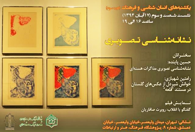 شصتوسومین نشست «یکشنبههای انسانشناسی و فرهنگ» با موضوع: «نشانهشناسی تصویری» روز یکشنبه ۱۷ آبان ماه ۱۳۹۴، از ساعت ۴ تا ۷ بعدازظهر در مکان جدید برگزاری نشست یکشنبهها واقع در پژوشگاه فرهنگ، هنر و ارتباطات برگزار خواهد شد. در این نشست فیلم مستند «گفتوگو با انقلاب» ساختهی آقای روبرت صافاریان به نمایش در خواهد آمد. سخنران اول این برنامه آقای دکتر حسین پاینده (نویسنده، منتقد ادبی، منتقد فیلم و استاد نظریه و نقد ادبی دانشگاه علامه طباطبائی) هستند که با عنوان «نشانهشناسی تصویری مذاکرات هستهای» صحبت میکنند و سخنران دوم آقای رامتین شهبازی (نویسنده و منتقد سینما و فیلم) هستند که صحبتهایشان را با عنوان «خوانش شیردل از عکسهای گلستان در مستند “قلعه”» ارائه خواهند کرد.