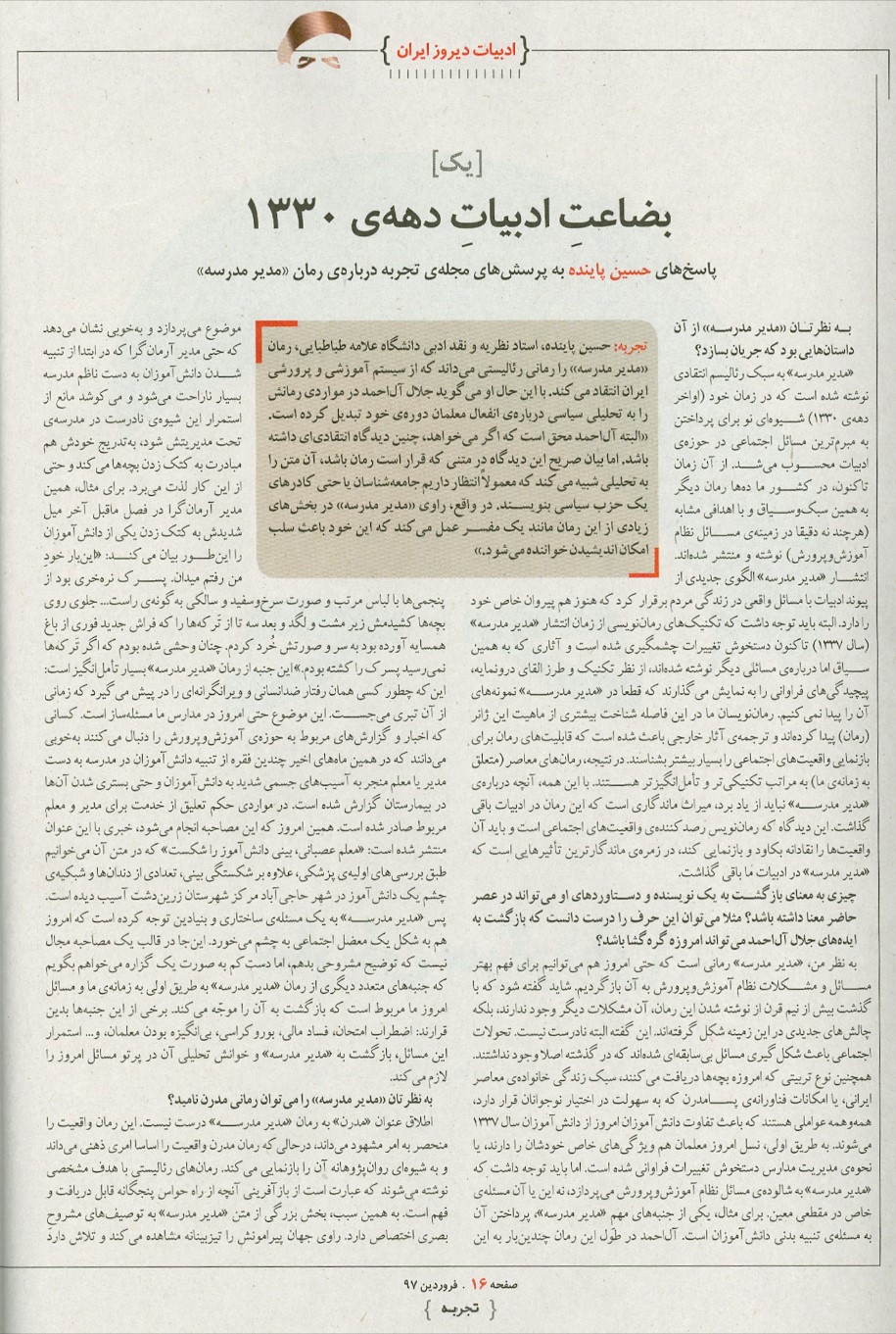 آنچه در زیر میخوانید، مصاحبهی حسین پاینده با مجلهی تجربه دربارهی رمان مدیر مدرسه نوشتهی جلال آلاحمد است که در شمارهی فروردین ۹۷ این نشریه منتشر شده است.